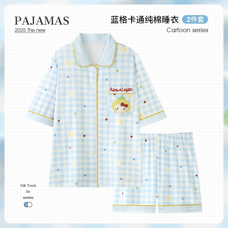 卡通可爱蓝色HelloKitty凯蒂猫格子睡衣女春秋纯棉长袖全棉家居服